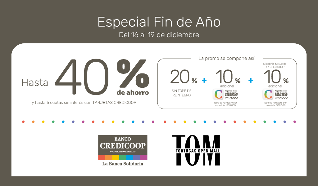 El reintegro aplica en hasta 6 cuotas con Tarjetas Credicoop y la financiación exclusivamente a Tarjetas de Crédito Cabal y Visa. Costo Financiero Total Nominal Anual (CFTNA) 0,0%, Tasa Nominal Anual (TNA) / Tasa Efectiva Anual (TEA) 0,0%. Promo válida en consumos presenciales con Tarjetas Credicoop o con QR de MODO a través de la app Banca Credicoop o MODO. Se excluye Agrocabal, Cabal Mayorista, Cabal Empresa, Visa Business y Visa Corporate. No aplica para pagos con dinero en cuenta y/o transferencia. Vigente del 16 al 19 de diciembre de 2025. Ejemplo 20%: en un consumo de $300.000 recibirá un reintegro de $60.000. Si el consumo es con QR de MODO recibirá un reintegro de $30.000 adicionales o $60.000 en el caso de cobrar haberes en el Banco (se excluye jubilaciones y pensiones). Los topes de MODO mencionados son por usuario por vigencia. La primer parte del reintegro se verá reflejado en el primer o segundo resumen de la tarjeta de crédito o dentro de los 60 días en el caso de consumo con tarjeta de débito, mientras que el adicional se acreditará en la cuenta abierta en Banco Credicoop dentro de los siguientes 30 días. Será condición esencial para participar de la misma que al momento de efectuar el reintegro, la tarjeta se encuentre vigente y en estado de cumplimiento normal. Y adicionalmente para el caso de consumos con QR tener una cuenta abierta en Banco Credicoop adherida a MODO. No participan los consumos realizados a través de los programas MasCuotasCabal-MiPyme y Cuotas MiPyme Payway, billeteras virtuales (excepto MODO) y POS móviles. Aplicable a la cartera de consumo. Más información sobre modalidad de reintegro, bases y condiciones en www.beneficios.bancocredicoop.coop. MODO es propiedad de Play Digital SA, y se encuentra sujeto a los términos y condiciones de uso disponibles en www.modo.com.ar.
