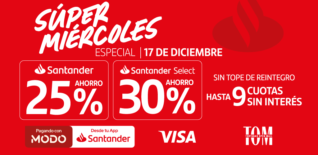 VÁLIDO EL 17/12/2025, ABONANDO CON QR A TRAVÉS DE LA APP SANTANDER O APP MODO CON TARJETA SANTANDER VISA RECARGABLE, CRÉDITO Y/O DÉBITO. EXCLUSIVO PARA CLIENTES CON PAQUETE, NO APLICA A TARJETAS DE DÉBITO VINCULADAS A CAJAS DE AHORRO EN PESOS GRATUITAS. NO ACUMULABLES CON OTRAS PROMOCIONES. EL AHORRO SE HARÁ EFECTIVO VÍA REINTEGRO DENTRO DE LOS 30 DÍAS DE EFECTUADO EL CONSUMO EN LA CUENTA BANCARIA ASOCIADA AL CLIENTE. ES NECESARIO QUE PREVIO A REALIZARSE EL REINTEGRO TENGAS ASOCIADA A MODO LA CUENTA BANCARIA QUE SEA DEL MISMO BANCO QUE LA TARJETA CON LA QUE REALIZASTE LA COMPRA. EN CASO LA COMPRA SEA REALIZADA CON UNA TARJETA ADICIONAL, EL REINTEGRO SE VERÁ REFLEJADO EN LA CUENTA BANCARIA DEL TITULAR DE LA MISMA. EJEMPLO: EN UNA COMPRA DE $180.000 REALIZADA CON TU TARJETA SANTANDER DE CRÉDITO VISA BLACK FINANCIADA EN NUEVE CUOTAS, RECIBIRÁS EN EL PRIMER RESUMEN, UN CONSUMO DE $20.000 Y UN REINTEGRO DE $54.000, HASTA EL NOVENO RESUMEN POSTERIOR A LA COMPRA, RECIBIRÁS UN CONSUMO DE $20.000 EN CADA UNO DE ELLOS. LOS ACCIONISTAS DE BANCO SANTANDER ARGENTINA S.A. (CUIT 30-50000845-4, CON DOMICILIO EN AV. JUAN DE GARAY 151, CIUDAD AUTÓNOMA DE BUENOS AIRES) NO RESPONDEN EN EXCESO DE SU INTEGRACIÓN ACCIONARIA.