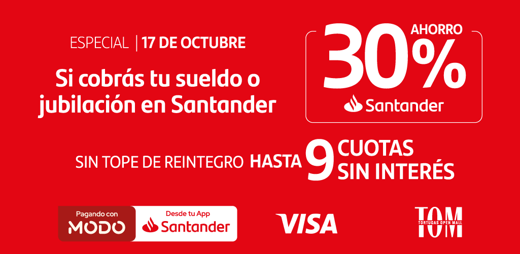 VÁLIDA EL VIERNES 17/10/2025, ABONANDO CON QR A TRAVÉS DE LA APP SANTANDER O APP MODO CON TARJETA SANTANDER VISA RECARGABLE, CRÉDITO Y/O DÉBITO. EXCLUSIVO PARA CLIENTES CON PAQUETE QUE COBREN SU SUELDO O JUBILACION EN BANCO SANTANDER, NO APLICA A TARJETAS DE DÉBITO VINCULADAS A CAJAS DE AHORRO EN PESOS GRATUITAS. NO ACUMULABLES CON OTRAS PROMOCIONES. EL AHORRO SE HARÁ EFECTIVO VÍA REINTEGRO DENTRO DE LOS 30 DÍAS DE EFECTUADO EL CONSUMO EN LA CUENTA BANCARIA ASOCIADA AL CLIENTE. ES NECESARIO QUE PREVIO A REALIZARSE EL REINTEGRO TENGAS ASOCIADA A MODO LA CUENTA BANCARIA QUE SEA DEL MISMO BANCO QUE LA TARJETA CON LA QUE REALIZASTE LA COMPRA. EN CASO LA COMPRA SEA REALIZADA CON UNA TARJETA ADICIONAL, EL REINTEGRO SE VERÁ REFLEJADO EN LA CUENTA BANCARIA DEL TITULAR DE LA MISMA. EJEMPLO: EN UNA COMPRA DE $180.000 REALIZADA CON TU TARJETA SANTANDER DE CRÉDITO VISA BLACK FINANCIADA EN NUEVE (9) CUOTAS, RECIBIRÁS EN EL PRIMER RESUMEN, UN CONSUMO DE $20.000 Y UN REINTEGRO DE $54.000, HASTA EL NOVENO RESUMEN POSTERIOR A LA COMPRA, RECIBIRÁS UN CONSUMO DE $20.000 EN CADA UNO DE ELLOS. LOS ACCIONISTAS DE BANCO SANTANDER ARGENTINA S.A. (CUIT 30-50000845-4, CON DOMICILIO EN AV. JUAN DE GARAY 151, CIUDAD AUTÓNOMA DE BUENOS AIRES) NO RESPONDEN EN EXCESO DE SU INTEGRACIÓN ACCIONARIA.
