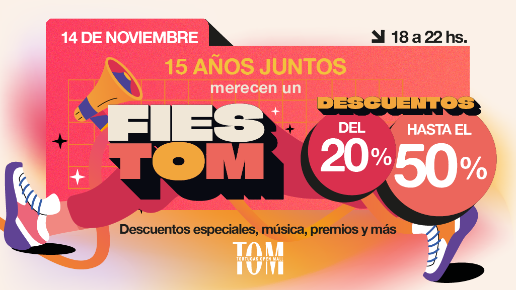 PROMOCIÓN VÁLIDA EL DIAVIERNES 14 DE NOVIEMBRE DE 2025 DE 18 A 22HS EN LOS LOCALES ADHERIDOS DE TOM - TORTUGAS OPEN MALL. HASTA CINCUENTA POR CIENTO (50%) DE DESCUENTO EN LOCALES ADHERIDOS. EL DESCUENTO SE REALIZARÁ SOBRE EL PRECIO FINAL DE PAGO. NO ES ACUMULABLE CON OTRAS VIGENTES. CONSULTE EN CADA LOCAL ADHERIDO CUANDO LOS PRECIOS SE EXHIBAN FINANCIADOS, EL PRECIO DE CONTADO DE LOS PRODUCTOS, EL PRECIO TOTAL FINANCIADO, EL ANTICIPO SI LO HUBIERE, LA CANTIDAD Y MONTO DE CADA UNA DE LAS CUOTAS, LA TASA DE INTERES EFECTIVA ANUAL APLICADA Y EL COSTO FINANCIERO TOTAL. CONSULTE EN EL RESPECTIVO LOCAL LOS MEDIOS DE PAGO. CONSULTE LOS LOCALES ADHERIDOS EN EL STAND DE ATENCIÓN AL CLIENTE SITO EN PLANTA BAJA DEL CENTRO COMERCIAL Y EN WWW.TORTUGASOPENMALL.COM.AR . B.A. MALL SAU AV. DEL LIBERTADOR 602, PISO 18°, CIUDAD AUTÓNOMA DE BUENOS AIRES. CUIT 30-70989881-3