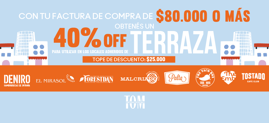 Promoción válida en el Shopping “Tortugas Open Mall” (TOM) entre el 11 de noviembre hasta el 31 de diciembre de 2025 inclusive o hasta agotar stock de mil quinientos (1500) unidades de vouchers (la “Vigencia”). Durante la Vigencia, aquellos clientes mayores de edad que presenten en el Stand de Servicios Al Cliente, una factura o ticket de compra de los locales y stands de TOM (no participan Coto y Sodimac) emitida durante la Vigencia por un valor igual o mayor a Pesos ochenta mil ($80.0000.-), recibirán: un (1) voucher válido por un descuento del cuarenta por ciento (40%) con un tope de pesos veinticinco mil ($25.000.-) para ser utilizado únicamente en los locales Palta, Tostado, Malcriado, Deniro o The Embers ubicados en TOM, de lunes a domingos entre el 11 de noviembre y el 31 de diciembre de 2025. Se entregará (1) un voucher por día por persona. Sólo podrá utilizarse un voucher por mesa. Consulte Bases y Condiciones en el Stand de Servicios al Cliente y en www.tortugasopenmall.com. BA MALL SAU (CUIT N° 30-70989881-3). La participación en la Promoción implica la aceptación de las Bases y Condiciones.