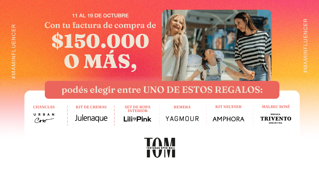 Promoción válida en el Shopping “Tortugas Open Mall” (el “Shopping”), Acceso Norte Ramal Pilar km 36,5, Tortuguitas, Pcia. de Buenos Aires, desde el día 11 de octubre de 2025 hasta las 21.30hs del día 19 de octubre de 2025 (ambos días inclusive) o hasta agotar stock de Regalos (conforme stock que se indica a continuación), lo que ocurra primero (el “Plazo de Vigencia”). Durante el Plazo de Vigencia, los mayores de edad que presenten en el Stand de Participación, junto con los datos y requisitos establecidos en las Bases y Condiciones, una factura o ticket de compra emitida/o durante el Plazo de Vigencia en los Locales y/o Stands del Shopping (excluidos COTO y Sodimac que NO participan de la presente promoción) por un valor igual o superior a Pesos ciento cincuenta mil ($150.000.-), tendrán la posibilidad de elegir uno de los siguientes Regalos adicionales, sujeto a disponibilidad de stock: (I) un voucher válido por un par de chanclas de la marca Urban Cow (800 unidades) o (II) un voucher válido por un kit de cremas de la marca Juleriaque (600 unidades) o (III) un voucher válido por un set de ropa interior de la marca Lili Pink (600 unidades) o (IV) un voucher válido por una remera de la marca Yagmour (600 unidades) o (V) un voucher valido por un kit neceser de la marca Amphora (600 unidades) o (VI) un vino Malbec Rosé bodegas Trivento 750ml (500 unidades). El voucher recibido deberá ser presentado hasta el 19 de octubre de 2025, en el local de la marca del Shopping indicada en cada voucher. Cada factura/ticket de compra podrá utilizarse sólo una vez y no se podrán sumar y/o acumular facturas y/o tickets para llegar al monto establecido. Solo se entregará un Regalo por persona por día. No acumulable con otras promociones. Los vouchers no son acumulables. Consulte Bases y Condiciones en el Stand de Atención al Cliente del Shopping y en www.tortugasopenmall.com . La participación en la presente promoción implica la aceptación de las Bases y Condiciones. Organiza BA MALL S.A.U (CUIT N° 30-70989881-3), Amaro Avalos 2829, PB, Vicente Lopez, Provincia de Buenos Aires.