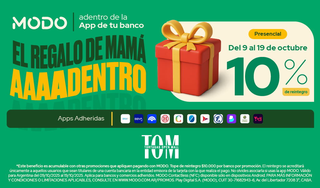 *Este beneficio es acumulable con otras promociones que apliquen pagando con MODO. Tope de reintegro $10.000 por banco por promoción. El reintegro se acreditará únicamente a aquellos usuarios que sean titulares de una cuenta bancaria en la entidad emisora de la tarjeta con la que realiza el pago. No olvides asociarla si usas la app MODO. Válido para Argentina del 09/10/2025 al 19/10/2025. Aplica para bancos y comercios adheridos.MODO Contactless (NFC) disponible sólo en dispositivos Android. PARA MÁS INFORMACIÓN Y CONDICIONES O LIMITACIONES APLICABLES, CONSULTE EN WWW.MODO.COM.AR/PROMOS. Play Digital S.A. (MODO), CUIT 30-71682943-6, Av. del Libertador 7208 3°, CABA.
