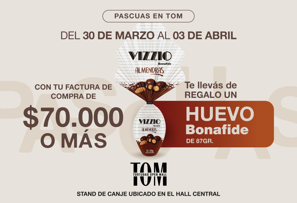 Promoción válida en el Shopping “Tortugas Open Mall” (el “Shopping”), Acceso Norte Ramal Pilar km 36,5, Tortuguitas, Pcia. de Buenos Aires, desde el día 30 de marzo de 2026 hasta las 21:30 hs del día 03 de abril de 2026 (ambos días de 10 a 22hs) o hasta agotar stock de regalos (conforme stock que se indica a continuación), lo que ocurra primero (el “Plazo de Vigencia”). Durante el Plazo de Vigencia, los mayores de edad que presenten en el Stand de Participación, junto con los datos y requisitos establecidos en las Bases y Condiciones- una factura o ticket de compra emitida/o durante el Plazo de Vigencia en los Locales y/o Stands del Shopping (excluidos COTO y Sodimac que NO participan de la presente promoción) por un valor igual o superior a pesos setenta mil ($70.000.-) se llevarán de regalo un (1) huevo de pascuas marca BONAFIDE de 87 gramos (stock 550 unidades). Cada factura/ticket de compra podrá utilizarse sólo una vez y no se podrán sumar y/o acumular facturas y/o tickets para llegar al monto establecido. Solo se entregará un Regalo por persona por día. No acumulable con otras promociones. Consulte Bases y Condiciones en el Stand de Atención al Cliente del Shopping y en www.tortugasopenmall.com. La participación en la presente promoción implica la aceptación de las Bases y Condiciones. Organiza BA MALL S.A (CUIT N° 30-70989881-3), AV. DEL LIBERTADOR 602, PISO 18°, CIUDAD AUTONOMA DE BUENOS AIRES.