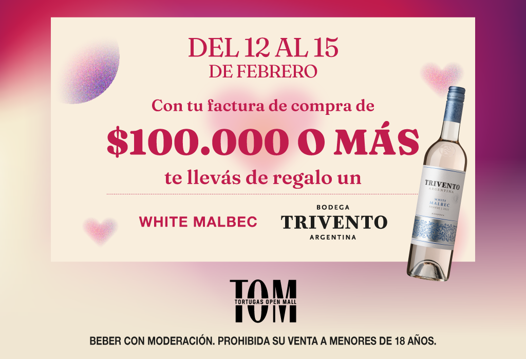 Promoción válida en el Shopping “Tortugas Open Mall” (el “Shopping”), Acceso Norte Ramal Pilar km 36,5, Tortuguitas, Pcia. de Buenos Aires, desde el día 12 de febrero de 2026 hasta las 21.30hs del día 15 de febrero de 2026 (ambos días inclusive) o hasta agotar stock de Regalos (conforme stock que se indica a continuación), lo que ocurra primero (el “Plazo de Vigencia”). Durante el Plazo de Vigencia, los mayores de edad que presenten en el Stand de Participación, junto con los datos y requisitos establecidos en las Bases y Condiciones- una factura o ticket de compra emitida/o durante el Plazo de Vigencia en los Locales y/o Stands del Shopping (excluidos COTO y Sodimac que NO participan de la presente promoción) por un valor igual o superior a pesos cien mil ($100.000.-) se llevarán de regalo un (1) vino WHITE MALBEC bodega Trivento (stock 100 unidades). Cada factura/ticket de compra podrá utilizarse sólo una vez y no se podrán sumar y/o acumular facturas y/o tickets para llegar al monto establecido. Solo se entregará un Regalo por persona por día. No acumulable con otras promociones. Consulte Bases y Condiciones en el Stand de Atención al Cliente del Shopping y en www.tortugasopenmall.com. La participación en la presente promoción implica la aceptación de las Bases y Condiciones. Organiza BA MALL S.A (CUIT N° 30-70989881-3), AV. DEL LIBERTADOR 602, PISO 18°, CIUDAD AUTONOMA DE BUENOS AIRES.